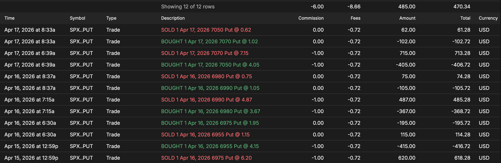 They will continue to be either Put Credit Spreads or slightly bullish Iron Condors. I would likely risk $1000 to $2000 again, so either $10-wide or $20-wide positions, and either look to make $100-$200 on each trade, or leave trade open until expiry if SPX moves against my trade, risking the entire $1000.