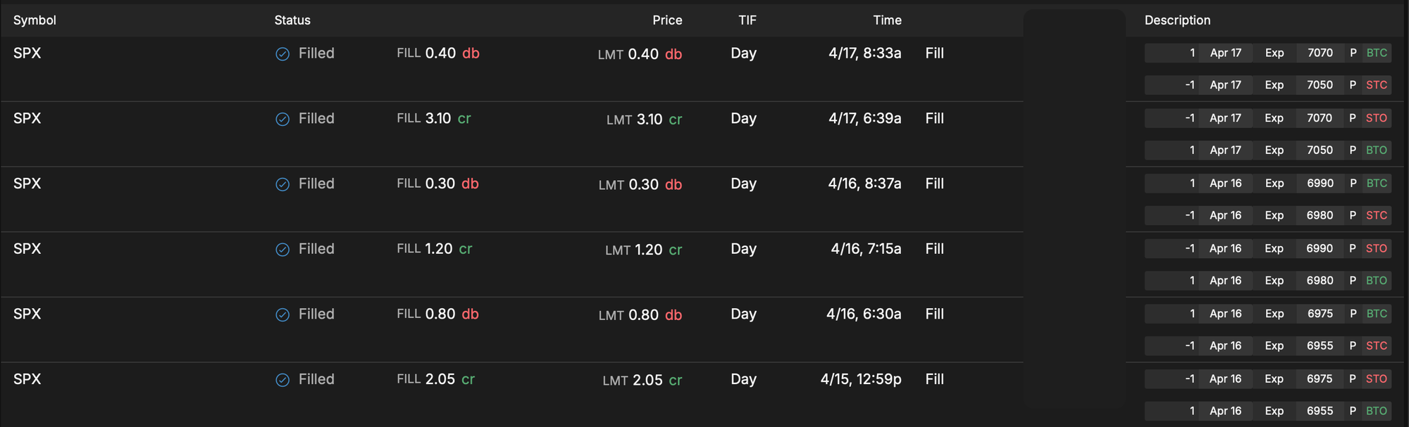 However, instead of going to Zero-DTE straightaway, I first tried to test the waters with a One-DTE. I placed an order for a $20-wide Put Credit Spread at 12:59 PM on Wednesday, 4/16, in the very last minute of the trading day, speculating that if the bullish run continues - even a small pop at the open on next day would give me a quick win. Of course, there was still an overnight risk, but I had placed the order just slightly out of the expected move range and so was optimistic I wouldn't lose the full amount. I received $2.05 in premium credit.
